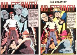 Kid Eternity is a fictional character, a comic book superhero that premiered in Hit Comics #25 written by Otto Binder, drawn by Sheldon Moldoff, and published by Quality Comics in December 1942. All of Quality’s intellectual properties were sold to DC Comicsin 1956 (though most of the said properties lapsed into public domain by that point), including the character.  The character has continued to appear (albeit infrequently) in DC comic books since his revival in the 1970’s.